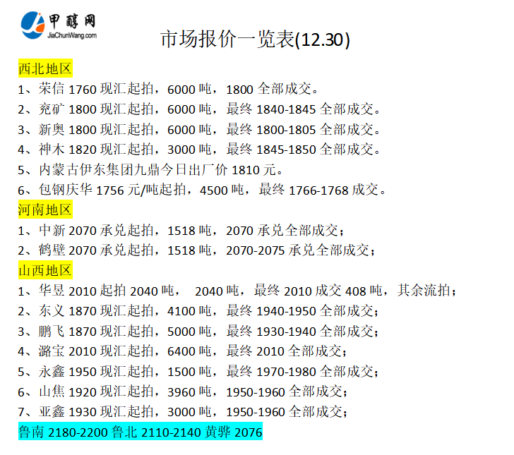 12月30日市场报价一览表
