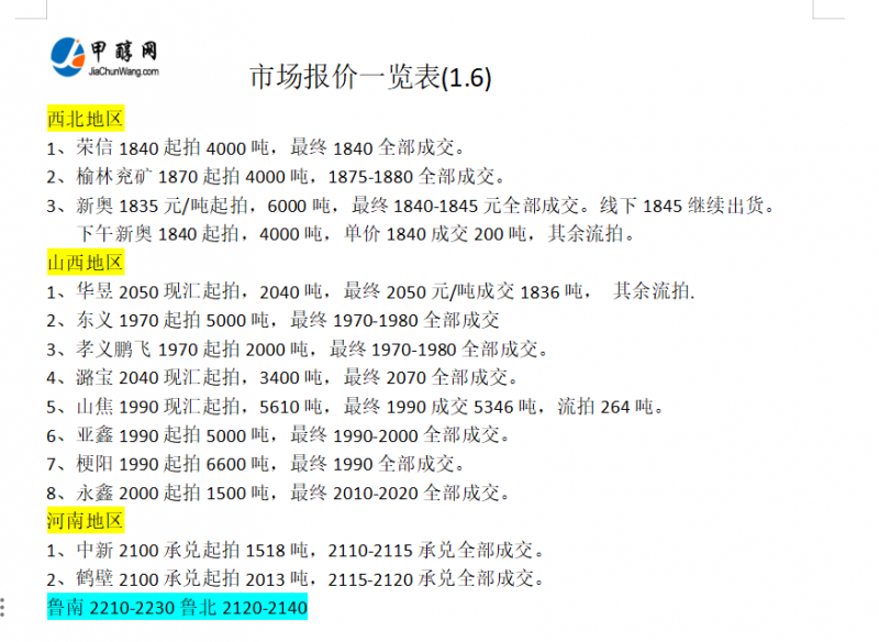 1月6日市场报价一览表