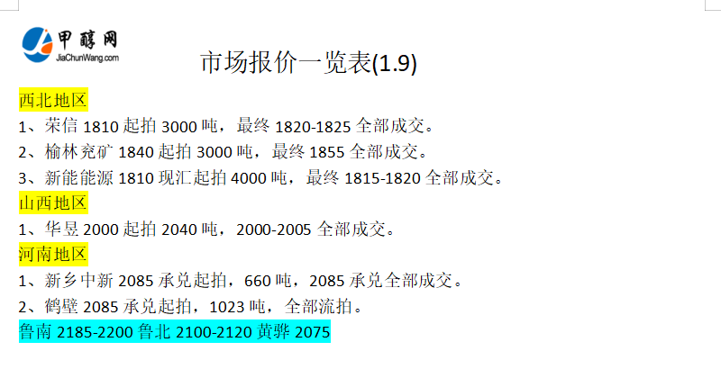 1月9日市场报价一览表