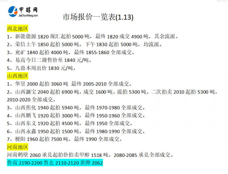 1月13日市场报价一览表
