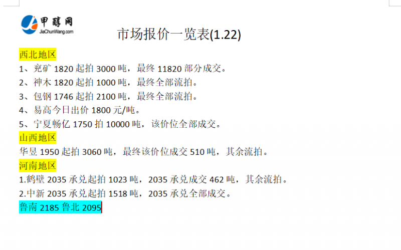 1月22日市场报价一览表