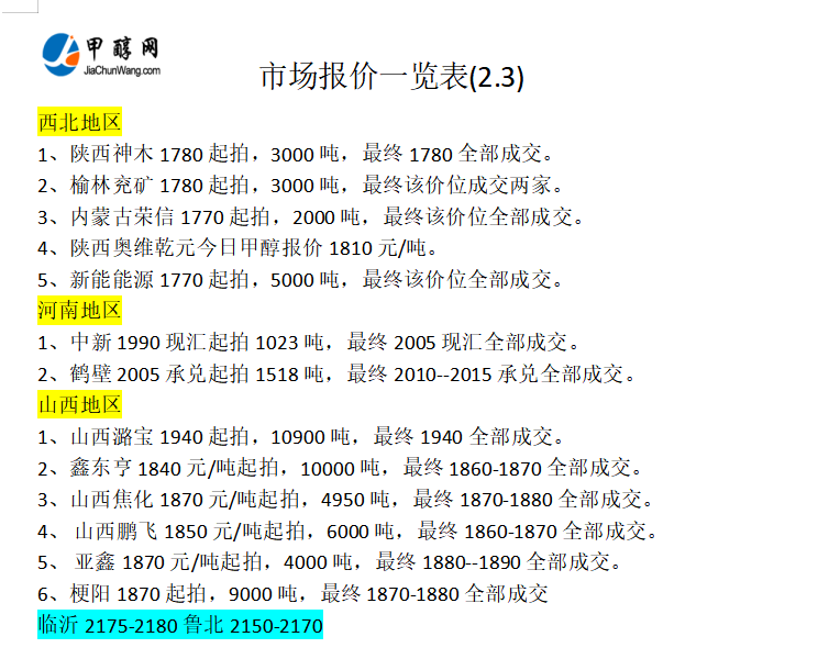 2月3日市场报价一览表