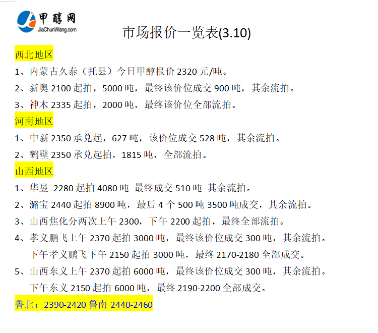 3月10日市场报价一览表