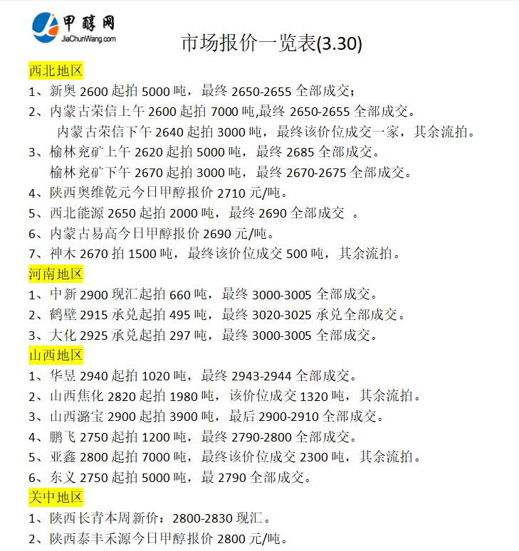 3月30日市场报价一览表