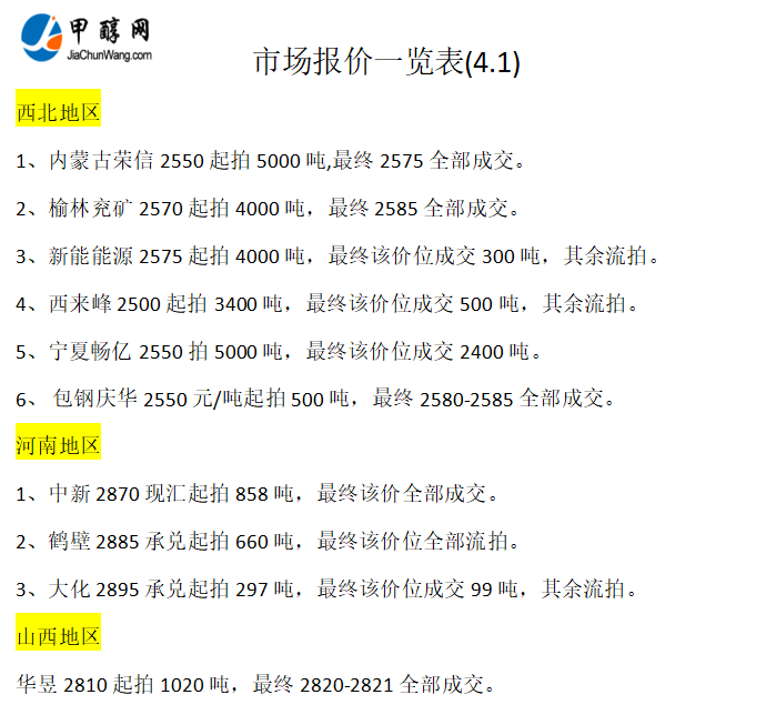 4月1日市场报价一览表